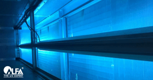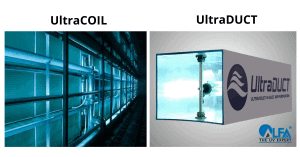 Alfaa UV’s UltraCoil and UltraDuct UVGI systems can also be installed in the ducts of heating, ventilating, and air conditioning (HVAC) systems and irradiate the small airborne particles containing microorganisms as the air flows through the ducts. Often, UVGI systems in ducts also direct UV light at the cooling coils and drain pans of air conditioning systems. Irradiating the cooling coils and drain pans can dramatically reduce mold and bacteria growth on the often-wet surfaces of cooling coils and drain pans, or destroy the microbial films that previously accumulated on the irradiated surfaces. Much of the research on the health benefits of UVGI has been performed in health care settings such as hospitals, including tuberculosis wards in hospitals. Other study sites have included barracks, schools, offices, and homes.