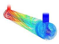 Based on the hydraulic properties of water, the reactor has been greatly optimized to guide the flow in a manner so as to maximize residence time and boost turbulence. The figure alongside illustrates a CFD-modeled reactor. Each coloured strand represents the path of an individual particle through the reactor. The colour changes from blue to red as the retention time and UV dose increases.